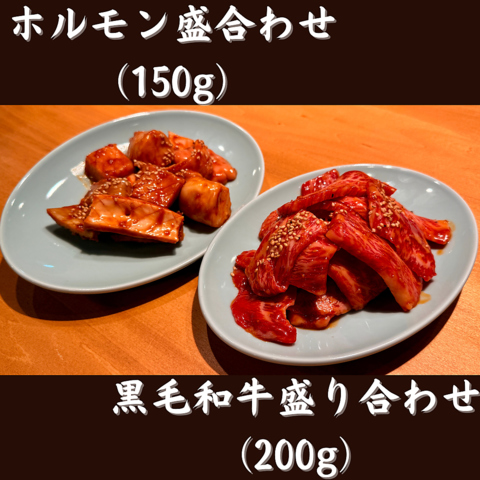 ホルモンもカルビも沢山食べたい…そんな時は!黒毛和牛やホルモンを贅沢に楽しめるコスパ最強の盛り合わせ!それぞれ黒毛和牛200g、ホルモン150gの2つの盛り合わせをご用意♪しっかり味付きだからタレ不要、そのまま旨さをガブリ!