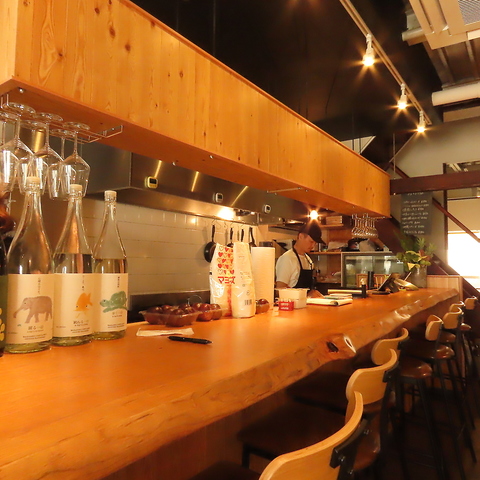 温かみのある木を基調とした落ち着いた雰囲気が特徴です。大きなカウンター席からはオープンキッチンの様子が見え、料理人の手際を楽しむことができます。明るすぎない照明が心地よい空間を演出し、リラックスしたひとときを過ごせ、一人での食事にもぴったりの場所です。