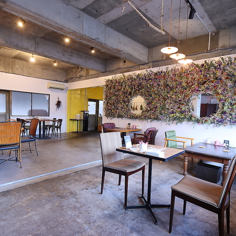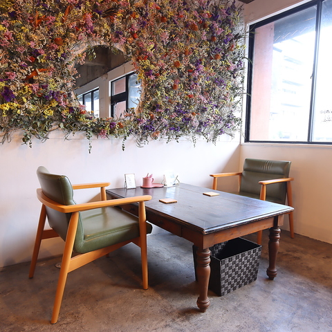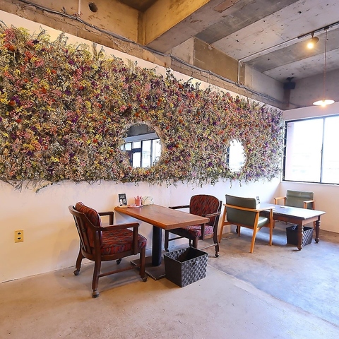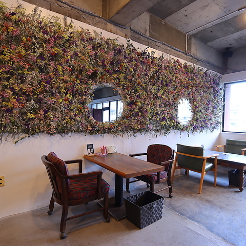 2000本のドライフラワーの花壁。大分初です!女子会やデートや落ち着いて過ごせるので、打ち合わせにも最適です。