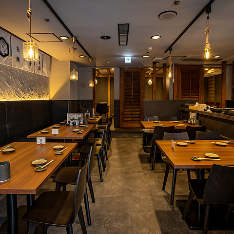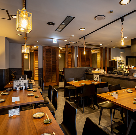 テーブル席を繋げれば大人数の宴会でのご利用も◎。当店はお客様のスマートフォンでお頼みいただくセルフオーダーを導入しているので、お好きなタイミングでのご注文が可能です。清潔感溢れるモダンな佇まいの中で、鮮度抜群の魚介や一本ずつ丁寧に焼き上げる焼鳥を。【忘年会・新年会・歓送迎会・デート・飲み放題】