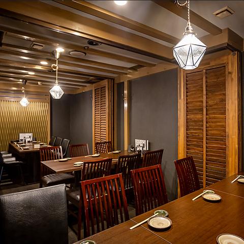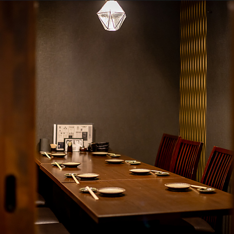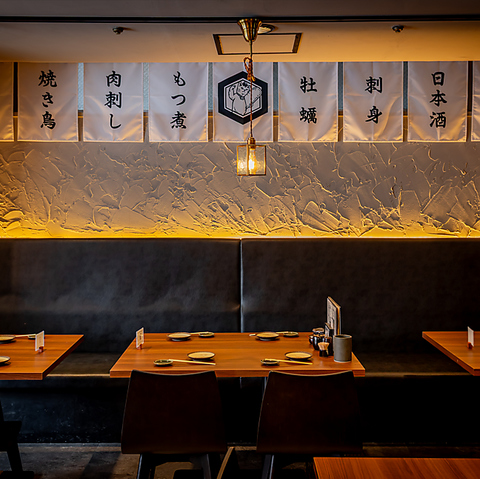 洗練された和モダンな空間。左官仕上げの表情豊かな壁に、温かい灯りが情緒を添えます。名物の「もつ煮」や「焼鳥」を掲げた暖簾の先には、シックな黒と木目が調和する大人な特等席が。落ち着いた雰囲気の中で、厳選された美酒と海鮮、そして贅沢なひとときを。【忘年会・新年会・歓送迎会・デート・飲み放題】