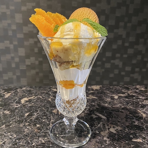 グラスに美しく層をなすフルーツ、クリーム、アイス。一口ごとに変わる味と食感の贅沢デザート。