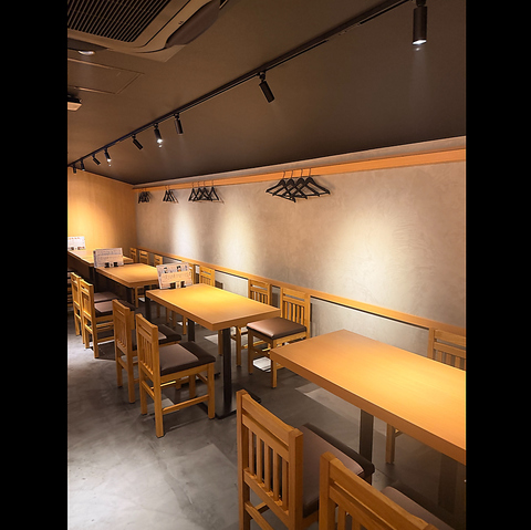 シンプルながらも木の温もりを感じられる木目が美しいテーブルと椅子、コンクリート調のクールな壁、優しい色合いの照明が調和し居心地のよい店内です!様々なシーンでご来店ください☆