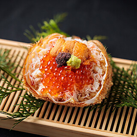 蟹の醍醐味を、昼にこそ味わう「特上」ランチ会席。握りやいくらと蟹の丼など濃厚な旨みを多彩な調理法でお楽しみいただけます。昼のご会食や大切なおもてなしにもふさわしい、風格ある内容です。