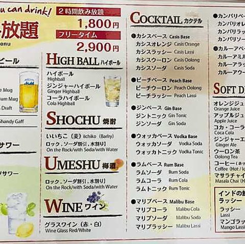 お料理と共に楽しんでいただけるよう、当店では約90種類もの豊富なドリンクをご用意しております。ビールやワインはもちろん、インドやネパールの珍しいお酒も楽しめます♪また、宴会に最適な飲み放題付きのコースもございますので、会社の飲み会や友人との集まりなど、シーンに合わせてお選びいただけます。