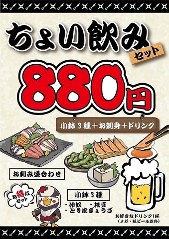 当店のおすすめ「チョイ飲みセット」は、気軽に楽しめる特別なプランです。小鉢3種に新鮮なお刺身、さらにお好きなドリンクが付いて、なんと880円(税込)!サクッと飲んで、サクッと酔えるお得なセットで、仕事帰りや友人との集まりにぴったりです。美味しい料理と共に、楽しいひとときをお過ごしください。
