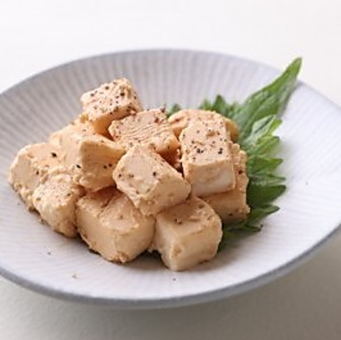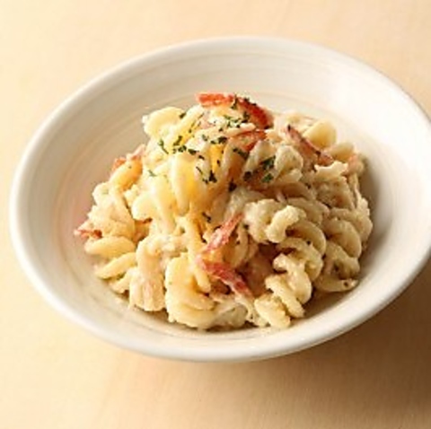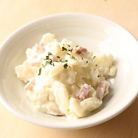 半熟玉子のポテトサラダは、黄身がとろりと溶け出し、クリーミーな味わいを引き立てます。カリカリのフライドオニオンとパルメザンチーズが絶妙に絡み合い、食感と風味のコントラストが楽しめる一品。