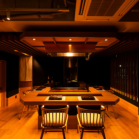 【ゆったり落ち着けるテーブル席】くつろぎのひとときを。程よい距離感と心地よい照明に包まれたテーブル席はゆったりと落ち着いてお過ごしいただける空間です。ご友人との食事やご家族との団らん、接待や会食など、様々なシーンに対応可。会話を楽しみながら、炭火焼きの香ばしさと素材の旨みをじっくりとご堪能ください。