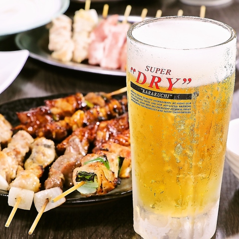 キンキンに冷やしたグラスに注いだ生ビールと焼き鳥の相性は◎疲れた体に染み渡ります♪1日頑張った自分へのご褒美にどうぞ!