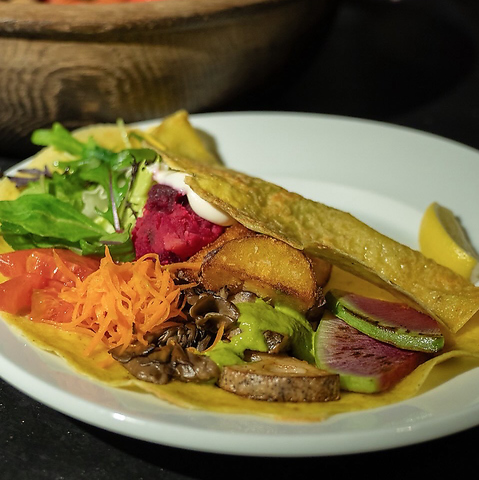 モーニング・ランチの定番メニュー。もちもちのグルテンフリー生地にたっぷりの野菜を乗せたクレープで1日を元気に。