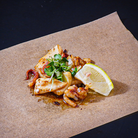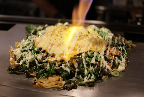 契約農園の無農薬ケールをふんだんに使用し、バーナーで香ばしく焦がすのが最大の特徴。ケール特有の香ばしさと旨みが凝縮され、やみつきになる美味しさです♪ここでしか味わえない、唯一無二の新しいお好み焼き体験をお届けします。目の前で焼き上がる様子を見られる「鉄板焼きライブ」を楽しみながら、ゆっくりご賞味ください♪