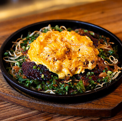 契約農園から届く新鮮な有機サラダケールをふんだんに使い、天然猪の旨みが詰まった粗挽き肉と、北海道小麦の特注低加水麺を鉄板で豪快に焼き上げます。仕上げは奥出雲「彩り天佑卵」のとろとろ玉子で贅沢に。熟成ソース、旨塩だれ、またはハーフ&ハーフから選べ、何度も食べたくなるNIKUTAMAの看板メニューです。