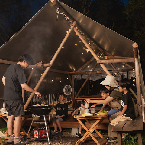 日常の喧騒から離れたい方のために、プライベートテントやグランピングBBQをご用意しました。プライベートテントは畳敷きで、靴を脱いでくつろげるプライベートな空間です。また、日帰りグランピングBBQは冷暖房完備のドーム型テントで、天候に左右されずに快適に過ごせます。