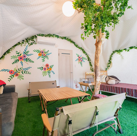 グループで楽しめる開放的なソファ席の他、カップルやご家族に人気の個室テントもご用意しています。テントの中は畳敷きで、靴を脱いでくつろぐことができます。まるで自分たちだけの秘密基地のような空間で、特別な時間を過ごすことができます。