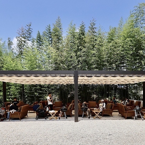 屋根付きの開放的な空間で、ゆったりとくつろげる本格的なソファ席です。2~6名様用のテーブルが8席あり、グループや団体様でのご利用に最適です。雨天でも安心してお過ごしいただけます。