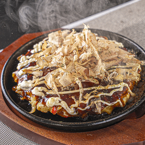 鉄板で焼き上げるお好み焼きも、ぜひ召し上がっていただきたい逸品。中でも、国産豚の旨みを生かした『豚たま』が一推しです。また、焼きそばもお好み焼き同様、豚・牛筋コン・海鮮ミックスの3種をご用意しております。飲んだ後の〆にもぴったりです◎皆様のご予約・ご来店を心よりお待ちしております。
