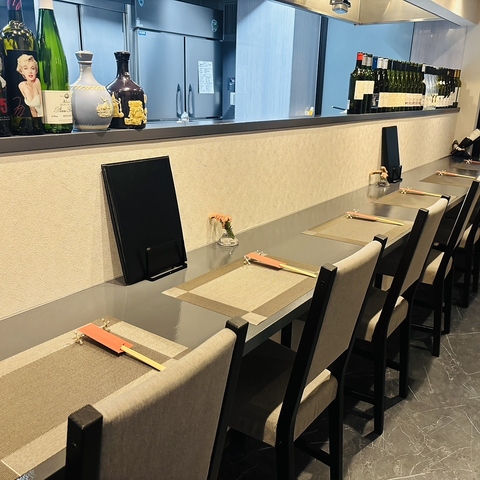 カウンター席は、お一人様でも気兼ねなくご利用いただけます。落ち着いた照明の中、ゆっくりと食事を味わいながら、お酒を片手にくつろぎの時間をお過ごしください。