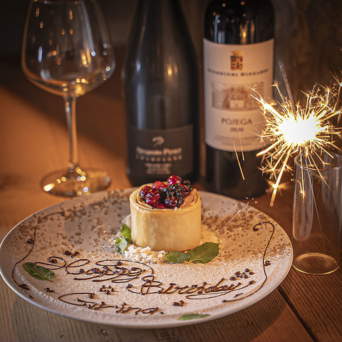 メッセージ付きのデザートプレートを2,000円(税込)でご用意させていただきます♪電気を暗くして音楽をかけ、プチ花火と共にご提供させていただく演出も可能です!ご利用の際は前日までにお電話にてご予約お願い致します♪写真も撮影させていただきますので、思い出に残る特別な一日をぜひ当店でお楽しみください!!