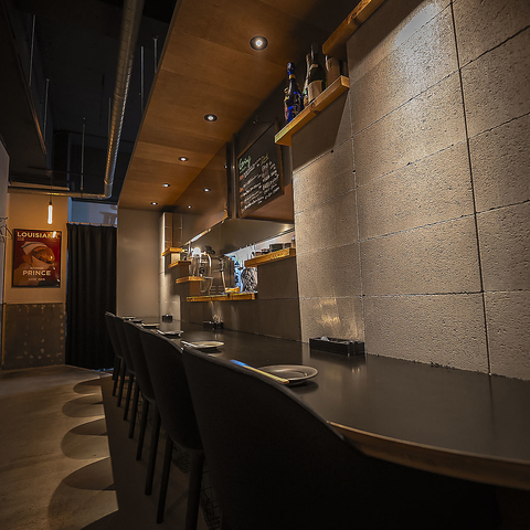 オープンキッチンのカウンターは、火の入れ方や盛り付けの細部が見える距離感!でも、決して“かしこまらない”空気がここにはあります♪ほどよい距離感で自然と交わる会話、落ち着いた照明と心地いい音楽の中、ゆったりと流れる時間をお楽しみください♪