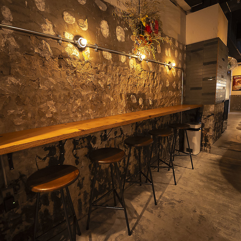 【壁沿いのカウンター席】壁沿いカウンター席は、落ち着いた雰囲気の中でお食事が楽しめるお席となっております♪当店は照明などの内装にもこだわっており、心地よい空間を演出♪木と照明の温かいぬくもりが感じられるカウンター席を、デートや女子会、仕事帰りのお食事など多彩なシーンでご利用ください!
