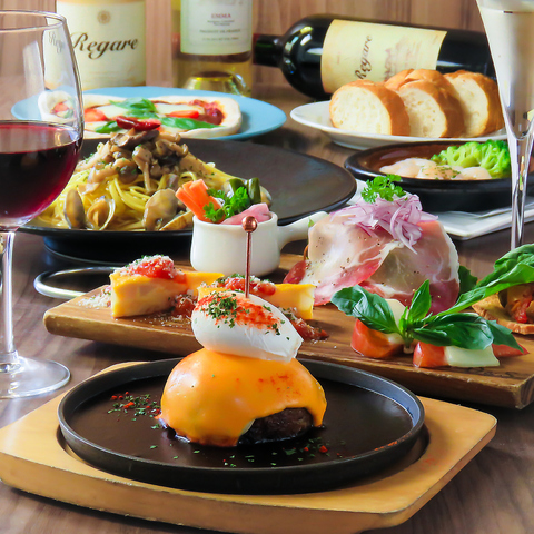 映え間違いなし!当店人気NO.1の「ポーチドエッグのチーズハンバーグ」をメインに、多彩なイタリアンが楽しめるコース♪イタリアンと言えばの「ピザ」に「パスタ」「アヒージョ」などバラエティ豊かにお届けいたします!こちらは2時間飲み放題付◎スパークリングワインをはじめ、30種類以上のドリンクが飲み放題です!気心知れたご友人との飲み会や女子会などにご利用ください★