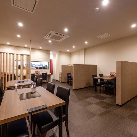店内は全体的に明るく、清潔感のある雰囲気。各テーブルにはIHが設置されており、コース料理に合わせて丁寧に提供されます。仕切りのあるテーブル席は、家族利用から職場の会食まで幅広く活用されており、シーンに合わせた心地よい距離感が保てるのが特長です。