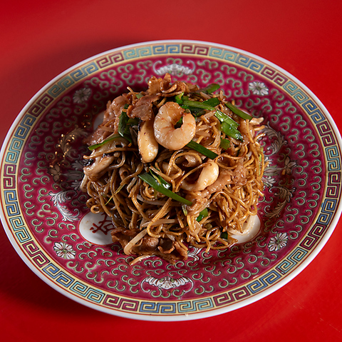 エビ・イカ・豚・ニラ・モヤシを濃厚オイスター醤油で香ばしく炒めた看板麺!濃厚で本格的な味わいをお楽しみしていただけます。ぷりっぷりとのエビと歯切れの良い麺との相性が◎〆におすすめです!