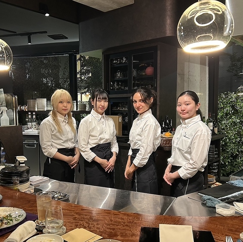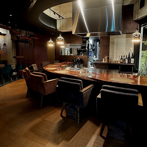 【三軒茶屋駅より徒歩5分】木の温もりを感じる半円形のカウンター席は、食事を楽しむだけでなく会話を交わすのにも最適です。席間に余裕があるので、一名様でもお気軽にご利用いただけます。目の前で望める調理風景や鉄板パフォーマンス、シェフとの会話も是非お楽しみください!