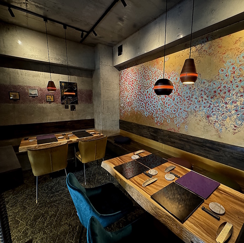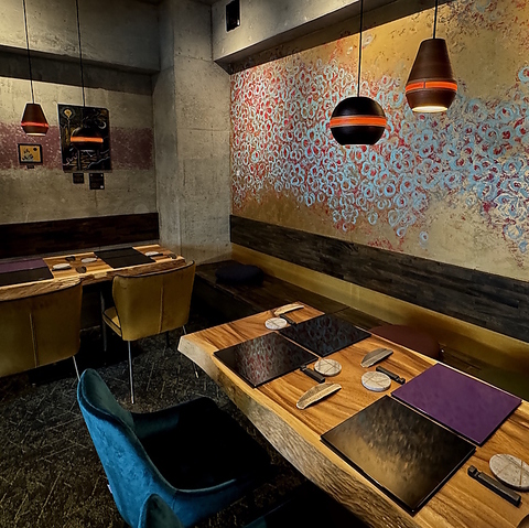 テーブルやカウンターには無垢も木材を使用し、落ち着いてお食事を楽しんでいただけるような椅子をご用意しております。お履き物を脱いでお上がりいただく床には旅館を彷彿させる素材を用い、半個室には前衛的な床材が敷かれております。