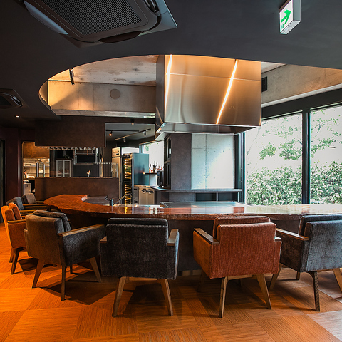 【三軒茶屋駅より徒歩5分】木の温もりを感じる半円形のカウンター席は、食事を楽しむだけでなく会話を交わすのにも最適です。席間に余裕があるので、一名様でもお気軽にご利用いただけます。目の前で望める調理風景や鉄板パフォーマンス、シェフとの会話も是非お楽しみください!