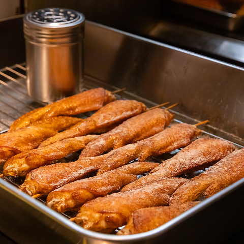 「旧ふく手羽」名物の手羽先の味を「手羽いちず」でもしっかりと伝承しております。厳選された素材・秘伝のタレ・秘伝のパウダーで味付けされた絶品手羽先です☆お酒との相性バッチリ◎中毒性のある味付けで、何本も食べてしまいます♪ふく手羽から代々引き継がれてきた味を是非一度お試しください!お時間ない方はお持ち帰りも可能です!