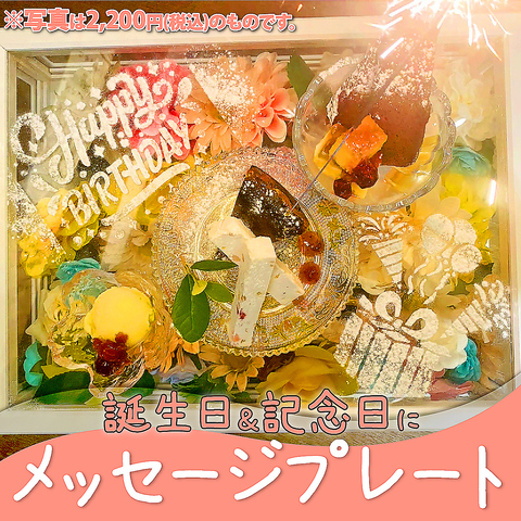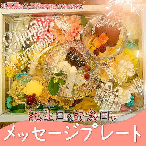お祝いなどのサプライズに最適♪メッセージプレートは1,000円/2,000円/4,000円(税抜)とご用意◎お写真はイチオシの2,000円のプレートです★4,000円は迫力のテーブルアートをご用意!!誕生日や記念日は勿論、送別会などにもオススメ★前日の23時までの要予約◎※予約時にデザートプレートの価格、お名前をお伝え下さい!