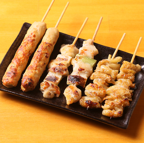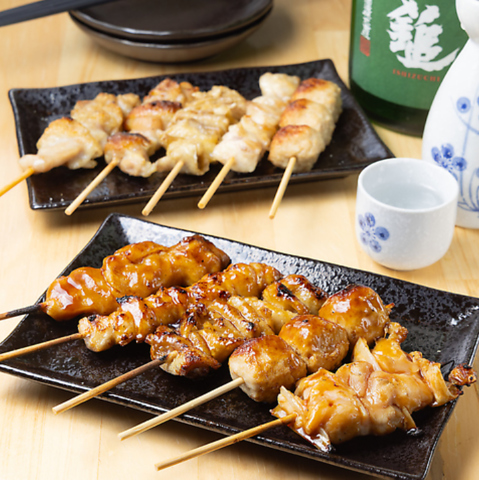 焼き鳥が1串から注文可能で、なんと1本43円(税込)~!タレ・塩からお味も選べます♪ももやねぎまの定番はもちろん、なんこつやさえずりなど全7種ございます!プラス20円でわさびもも、ゆずこしょうももやチーズつくねなどトッピング変わり串もご注文いただけます♪