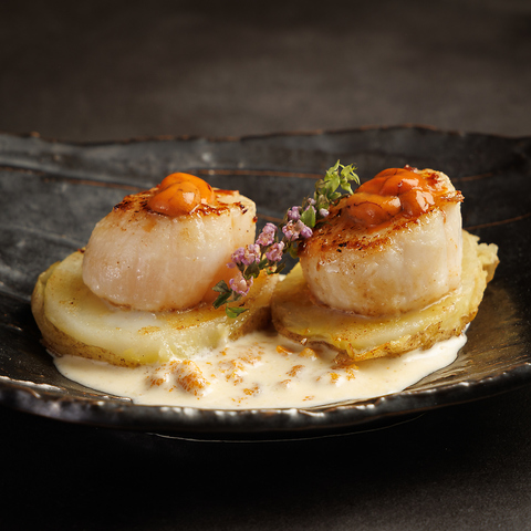 フォアグラを丁寧に焼き上げ、表面はカリッと、中はとろけるように仕上げた一皿。りんごのコンポートや和の食材を組み合わせ、甘みと旨みのコントラストを生かしています。鉄板焼きならではの香ばしさが鼻をくすぐる、創作性豊かな逸品です。