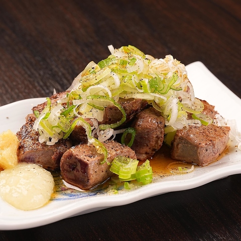 鉄板で表面をさっと焼き上げ、中はトロトロの絶妙なレア食感が楽しめる新鮮なレバテキ。ごま油と塩、ブラックペッパーでシンプルに味付けし、たっぷりのネギをのせてご提供します。お好みでにんにくやしょうがを添えて、香りと旨味をさらに引き立てる一品です。五感で味わう贅沢な鉄板焼きをぜひお楽しみください。