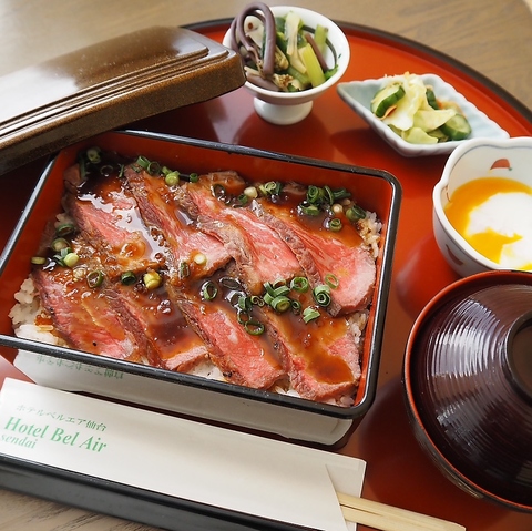 低温で旨味を閉じ込めた国産牛ローストビーフを、特製赤ワインオニオンソースと温玉で。芳香なコクがお肉の甘みを引き立てる、贅沢な一重です。「ご飯大盛+200円(税込)」