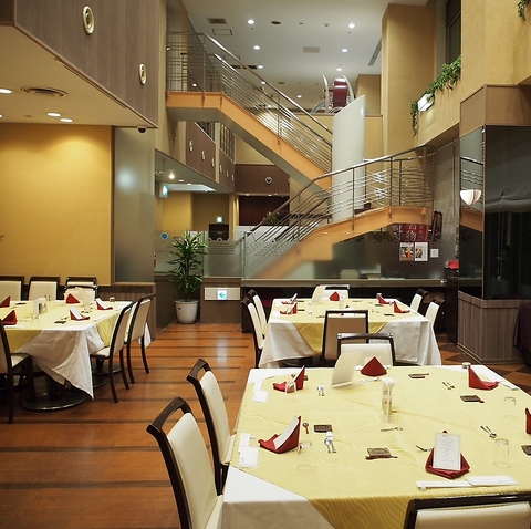 大人数の宴会も可能。着席・立食どちらでも対応可能です。自慢の吹き抜け空間は、昼間は明るく清々しい雰囲気を。夜は温かい光が織りなす幻想的な空間を演出します。