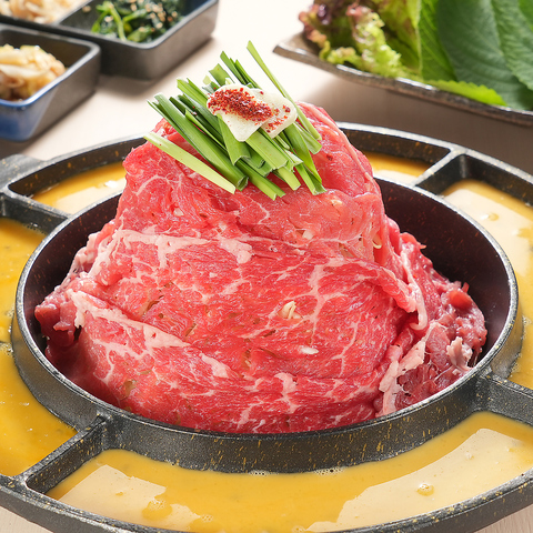 チーズタッカルビのように、山盛りのもやしと薄切り牛肉を重ねたウルル特製鍋。甘辛い出汁が染み込んだ具材は、まるで牛すき焼きのような深みのある味わいです。仕上げには、周りに広がる出汁に溶き卵を混ぜて絡めるのがおすすめ。まろやかなコクが加わり、一層贅沢な味に。見た目にも華やかで、SNS映えする人気の一品です。