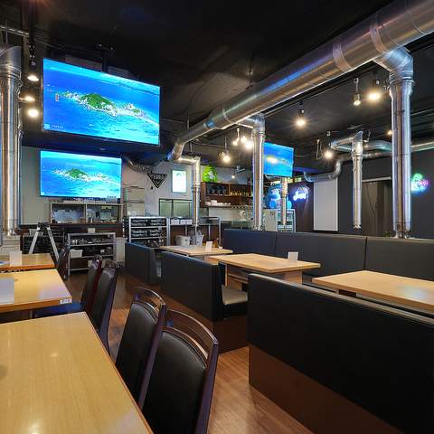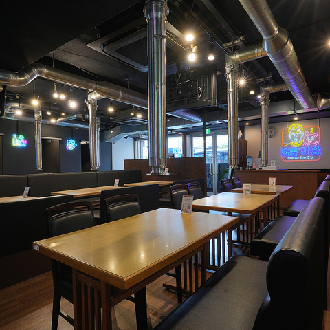 店内はネオンが灯る華やかな雰囲気で、外観の看板からも活気を感じられる造り。広々とした空間は貸切利用にも対応しており、大人数での宴会やパーティに最適です。テーブル席を中心に配置されているため、グループでの集まりや会社の飲み会にも使いやすく、シーンを選ばず楽しめる空間となっています。