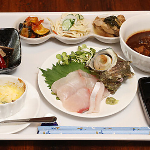 野菜、肉、魚をバランス良く味わえる“おばんざい”がおすすめ。日替わりのため、訪れる度に新たな味との出会いがあるのも魅力です。長浜市場の新鮮な魚介を使用。野菜は、糸島で育てた自家製のものを使う場合もございます。