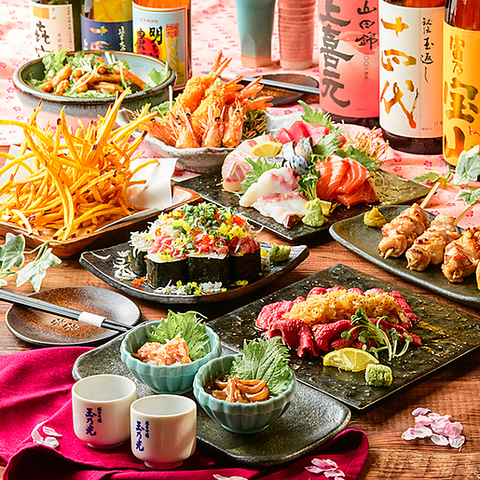 旨味と肉汁が溢れる「牛ハラミのスタミナ鉄板」。さらに鮮度抜群の「鮮魚3点盛り」、ジューシーな「阿波尾鶏つくね串」、手が止まらない人気!「名物さつまイモカリ」、「海鮮バラちらし」含む全7品!2時間飲み放題付きで、人気メニューをしっかり楽しめる大満足コースです。