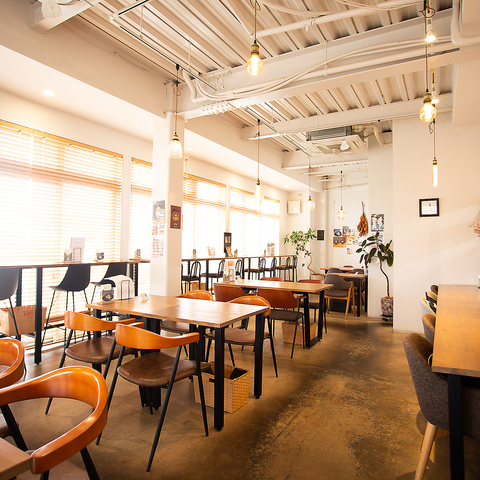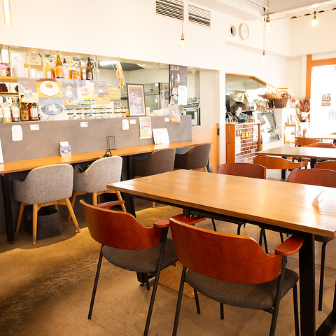 店内には、2名様用や4名様用のテーブル席がございます。シンプルなデザインながらもお洒落なテーブルとチェアが、モダンな内観に溶け込んでいます。開放的な空間でありながら、落ち着いた色調で統一されているため、友人との会話や会社の仲間との食事など、様々なシーンでリラックスして過ごしていただけます◎