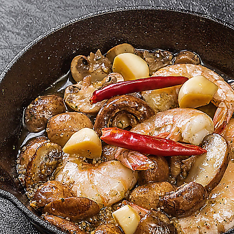 海老、イカ、ベーコンなど数種類の具材を贅沢に使用し、 にんにくとオリーブオイルでじっくり煮込んだ香り豊かなミックスアヒージョ。