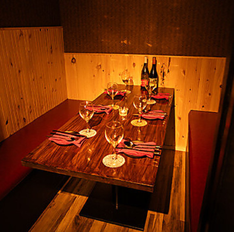 【完全個室】店内奥には扉付きの完全個室をご用意。6名様まで対応可能で、プライベート感をしっかり確保できます。記念日やお誕生日のお祝いはもちろん、合コンや女子会、接待など幅広いシーンに最適です。周囲を気にせず、ゆったりとした時間をお過ごしください。8名利用も可能ですが少々狭くなる可能性もございます。