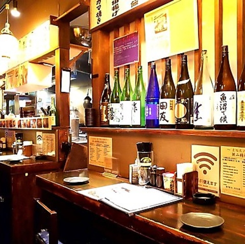 日本酒がずらっと並んだカウンター席でゆっくり美味しいお料理をお楽しみいただけます◎