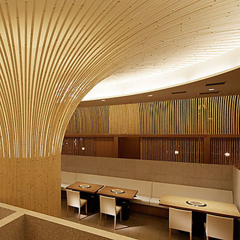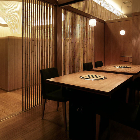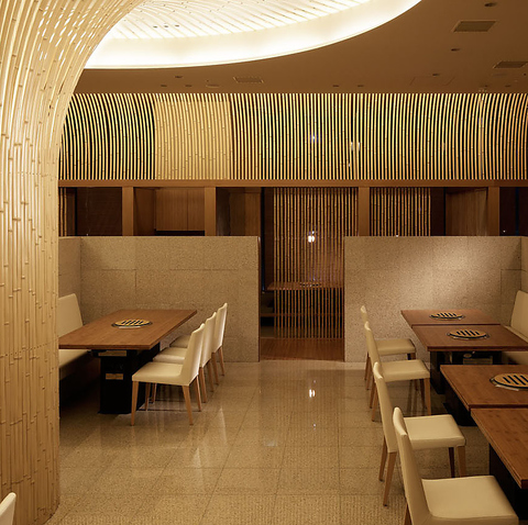 京都の竹林を思わせる、静かでダイナミックな空間が広がっています。天井まで伸びる竹細工のオブジェが圧巻で、広々としたテーブル席とゆったりとしたソファ席を完備。大人数でのご利用にも最適です。