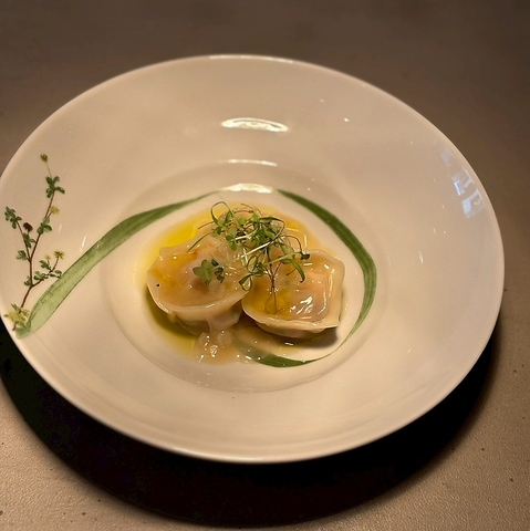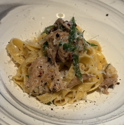 風味豊かな手打ちタリアテッレに、鶏肉をじっくり煮込んだ白ワイン仕立てのラグーソースを合わせた一皿。トマトを使わず、鶏の旨味と香味野菜、白ワインのやさしい酸味を活かした「ビアンコ(白)」仕立てのソースが、もちもちのパスタによく絡みます。素材の持ち味を引き立てる、繊細ながら深みのある味わい。