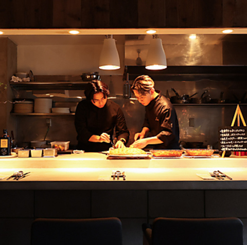 ライブ感満載の調理風景が楽しめるカウンター席を完備。