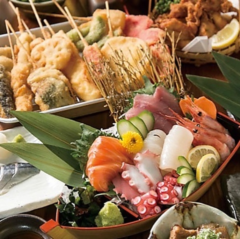新鮮な海の幸と揚げ物、一品料理を堪能できる【大阪満腹コース】は全11品に飲み放題がついた贅沢なコースを5380円(税込)でご提供♪当店自慢の串カツはもちろん、ふんだんに盛り付けされた盛り合わせは見た目にも豪華なコースとなっております★5日前からの予約となっておりますのでお早めにご連絡くださいませ!