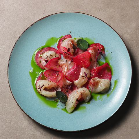 旬の鮮魚を丁寧に仕込み、素材の旨みを最大限に引き出した一皿。オリーブオイルとハーブ香る特製ソースが魚の甘みを引き立てます。季節ごとに変わる彩りも楽しめる、ワインとの相性抜群の前菜です。